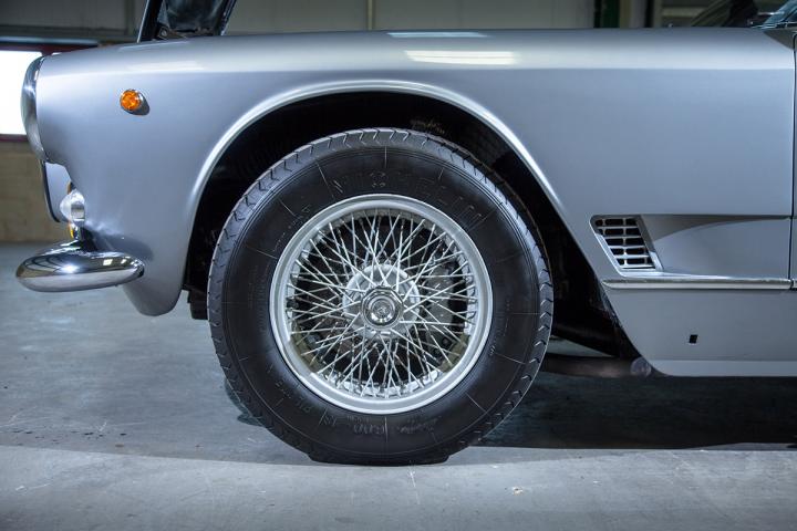 The 3500 GT was built on a tube platform chassis, constructed from tubes of square, round or elliptic section of Superleggera construction. Front suspension was by double wishbone coil springs, at the rear there was a Salisbury solid axle on semi-elliptic leaf springs, with hydraulic dampers an anti-roll bar and a longitudinal torque arm. Steering was of the recirculating ball type. The hydraulic brakes were initially Girling 12″ finned drum brakes front and rear; disc brakes were later introduced on the front wheels, and finally on all four. This Maserati 3500GT Vignale Spyder is equipped with front disc brakes and the optional Borrani knock-off wire wheels as well as a factory hardtop.
