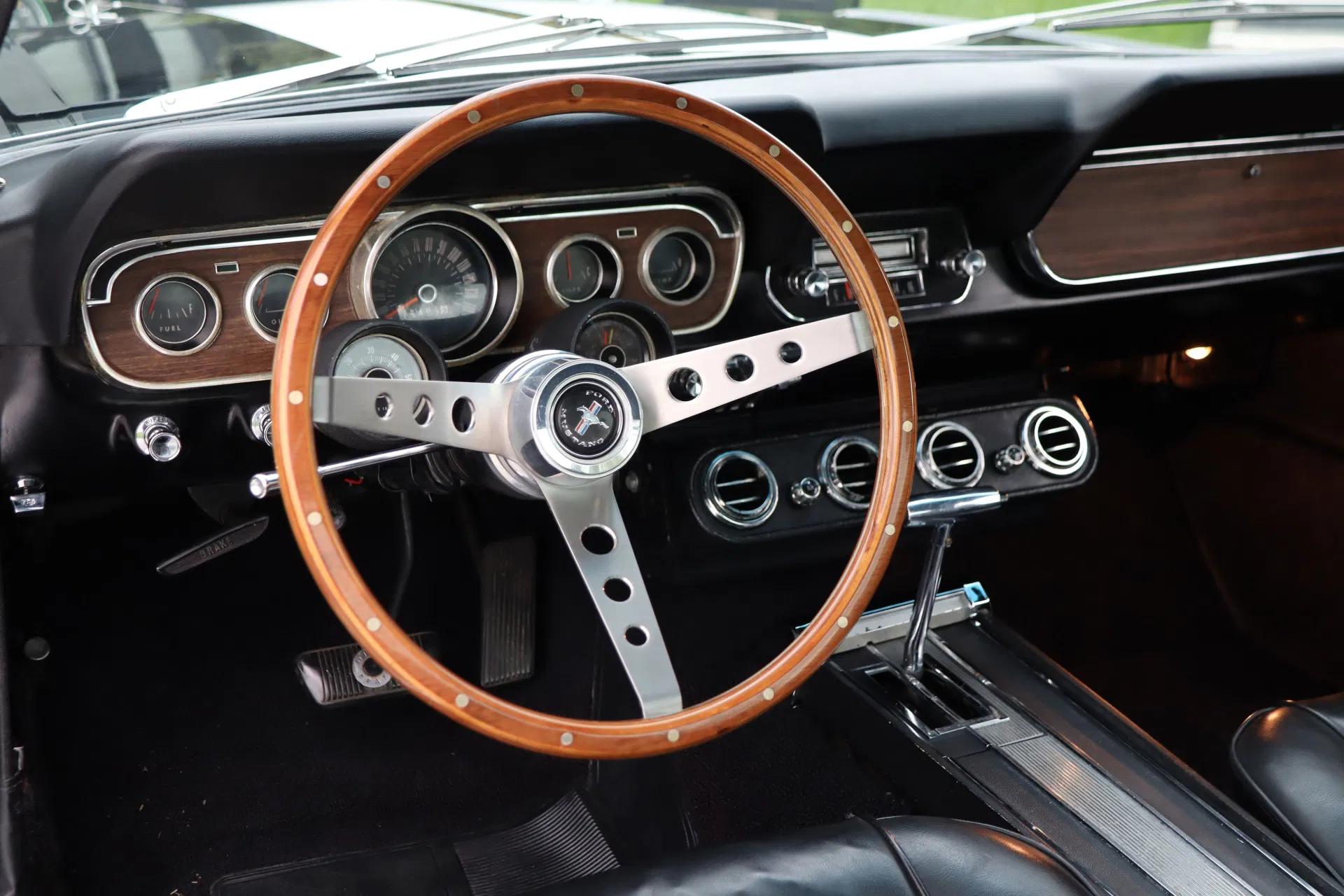 Het zwarte Pony-interieur verkeert nog in goede staat. De bekleding is uitgevoerd in zwart skai-leer. De bestuurders kijkt uit over het kenmerkende houten/aluminium stuurwiel en diepe wijzertellers. Ook is er een 'rally pack gauge cluster set' geplaatst met een tachometer en klokje. De originele Ford radio is nog aanwezig. Het dashboard en de instrumenten verkeren in goede staat. Ook de paneel- en hemelbekleding en vloerbekleding verkeren in goede staat. De airconditioning is bijgevuld. interieur vormt een ideale combinatie van comfort, originaliteit en klassieke looks. Bovendien is de Mustang een 2+2, waardoor 4 personen kunnen genieten van de rijervaring van de Mustang.