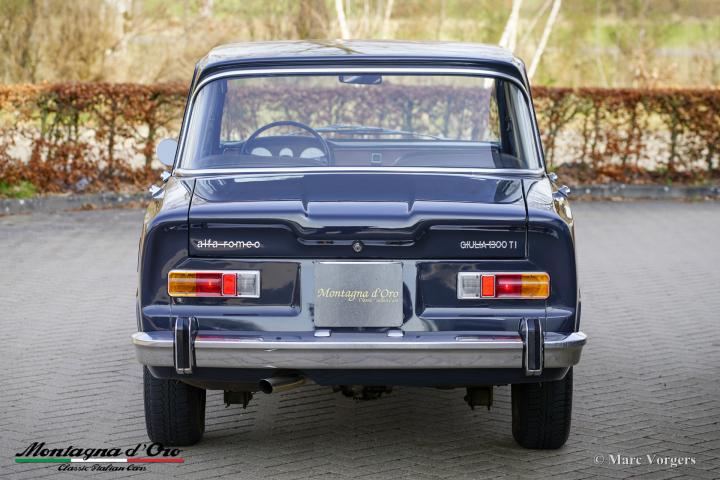Alfa Romeo Giulia 1300 TI, bouwjaar 1969. Chassisnummer AR10539*1070104*, motornummer AR00539*62659*. Carrosseriekleur donkergrijs (Antracite Inglese AR 736) gecombineerd met een zwart kunstlederen interieur en antracietkleurige (donkergrijze) vloerbedekking.