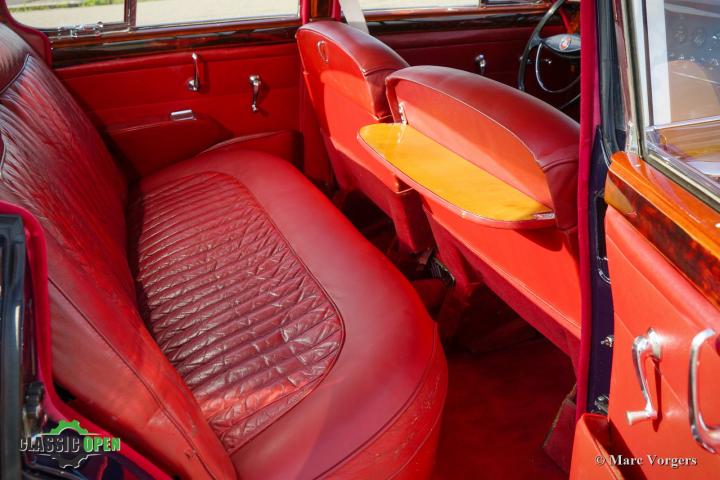 Kleur donkerblauw gecombineerd met een roodlederen interieur en rood tapijt.
