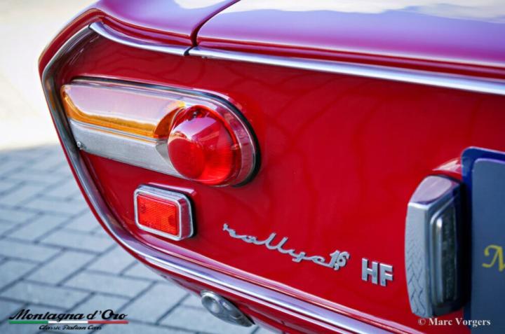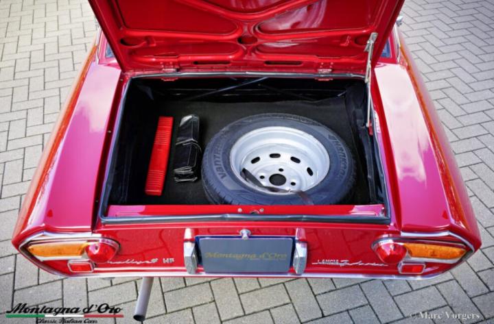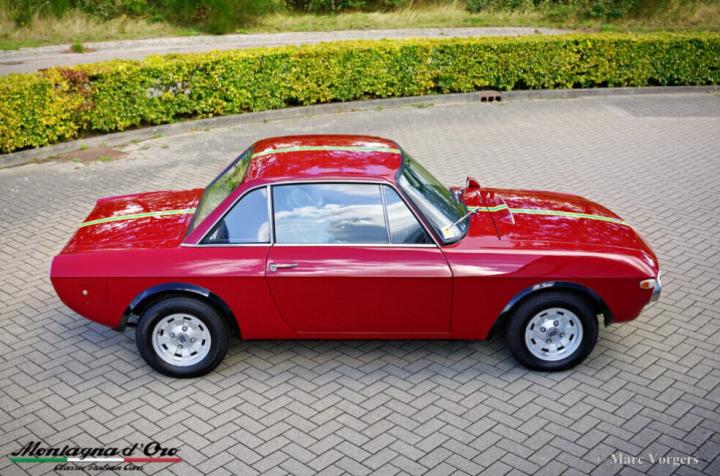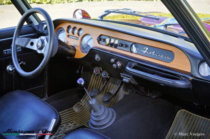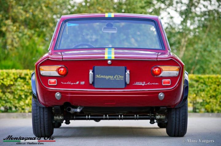 Kleur donkerrood met gele en blauwe strepen waar er 100 van gemaakt zijn dit is dus de “laatste” van die 100 (geel/ blauw van de stad Turijn) gecombineerd met een zwartlederen interieur en zwart tapijt. Deze Lancia Fulvia Coupé 1600 HF is de heilige graal van het Fulvia programma.