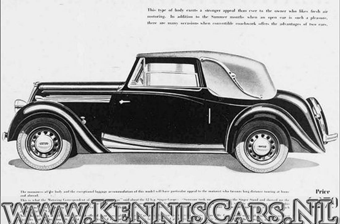 Singer 1938 Twelve Drop Head Convertible sold new for 279 GPB in 1938 This Singer DHC was the Singer company top line model. Technical specifications 11.4 HP 1525 cc four cylinder OHC engine with four speed gearbox and semi elliptic leaf springs front and rear. with a wheelbase from 8 feet and 7 inch.